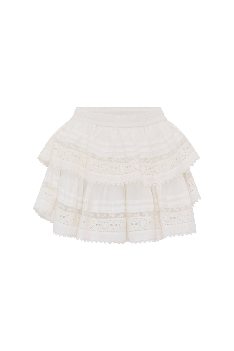 Our best-selling Ruffle Mini Skirt returns for Valentine’s Day with a crisp cotton poplin fabric with stunning details like Victorian-inspired laces with heart eyelets all over. She features intricate inset lace trims and allover pintuck details. The elasticated waistband offers flexibility in comfort and styling. Tiered ruffles exude effortless femininity. The mini is finished with a frayed, raw hem for added playfulness.