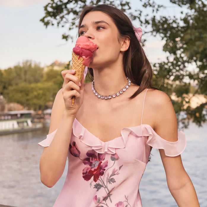 While you can never go wrong with a full-on monochromatic look, break things up by playing with texture. Start with your idea of the perfect base color for your look, whether it’s a bold color or a neutral tone like cream or beige. Ideally, choose a color you like to wear (or would like to wear) often so you can mix and match different pieces within the same color family. Neutrals are timeless. And in our case, a soft, pale pink IS a neutral. Then work different textures into the mix to add some depth with various fabrics, finishes, and patterns. Pair items of the same tint, like a pale mauve silky slip with pieces in lighter shades like a complimentary furry pink coat. The contrasting tones will add dimension to your ensemble.