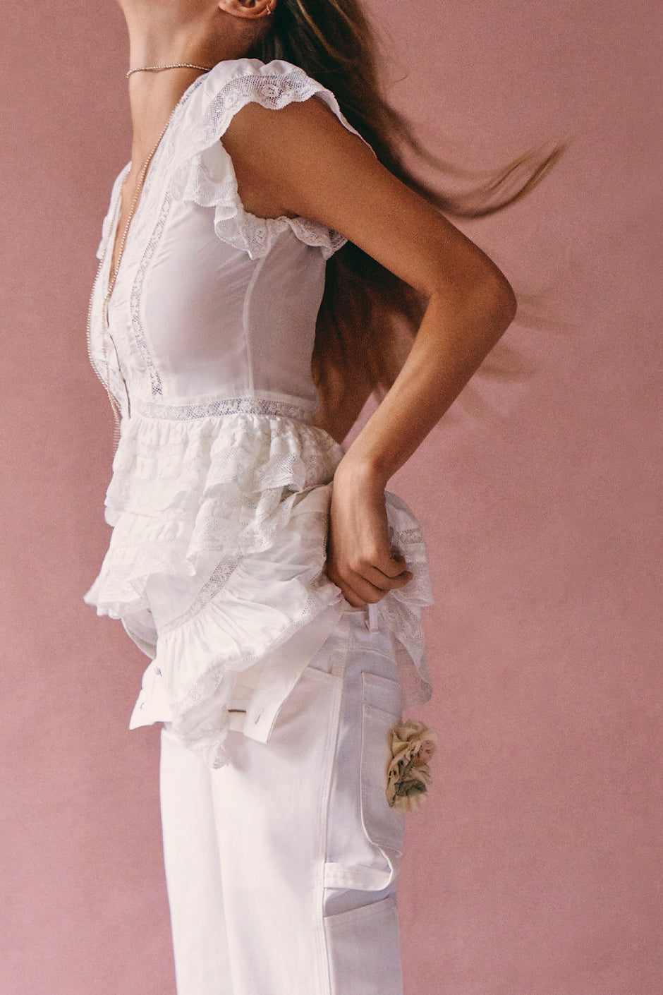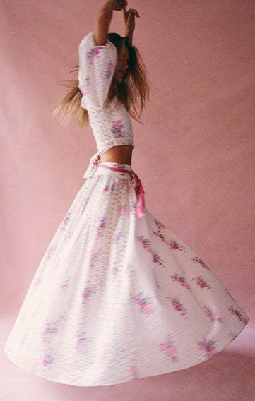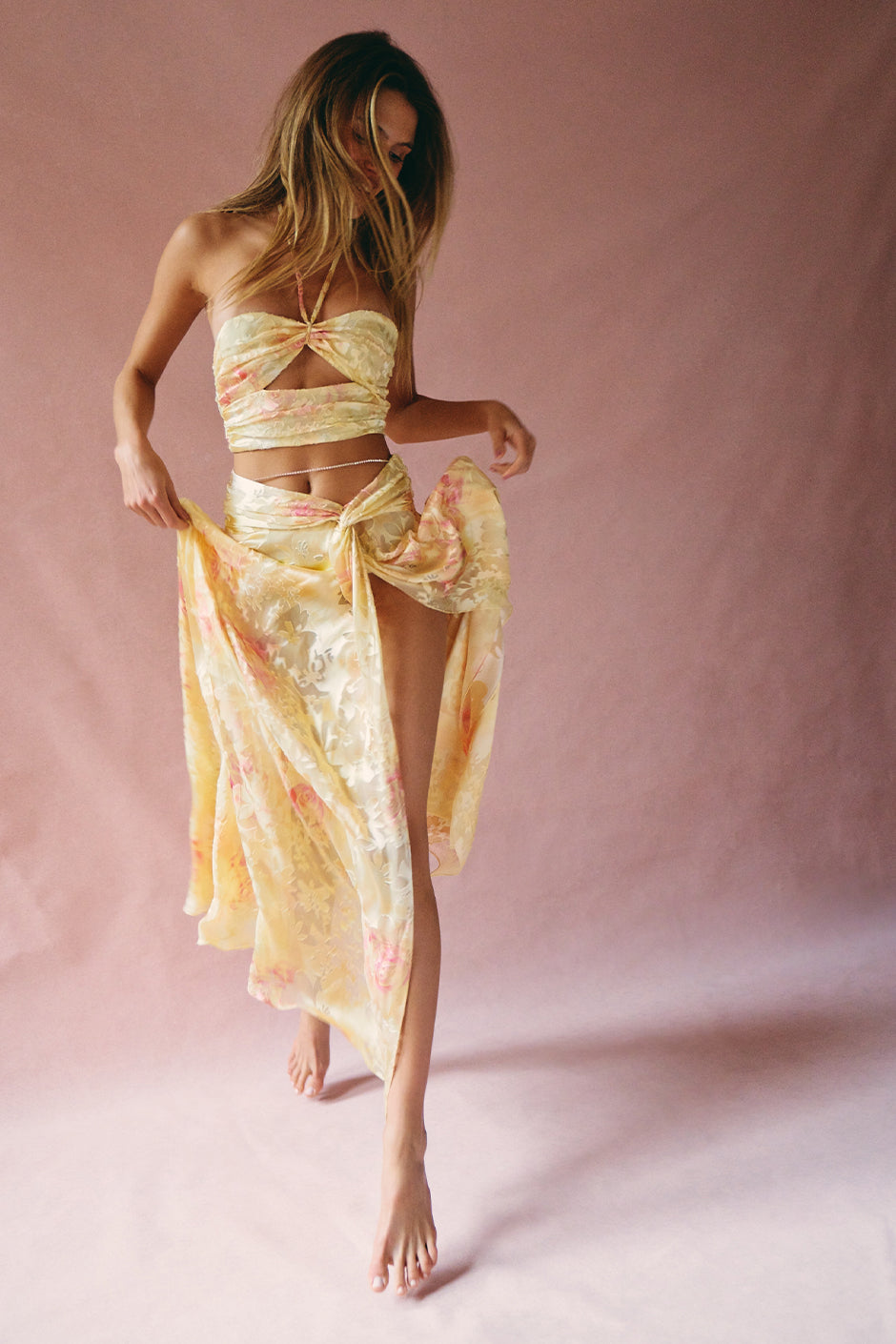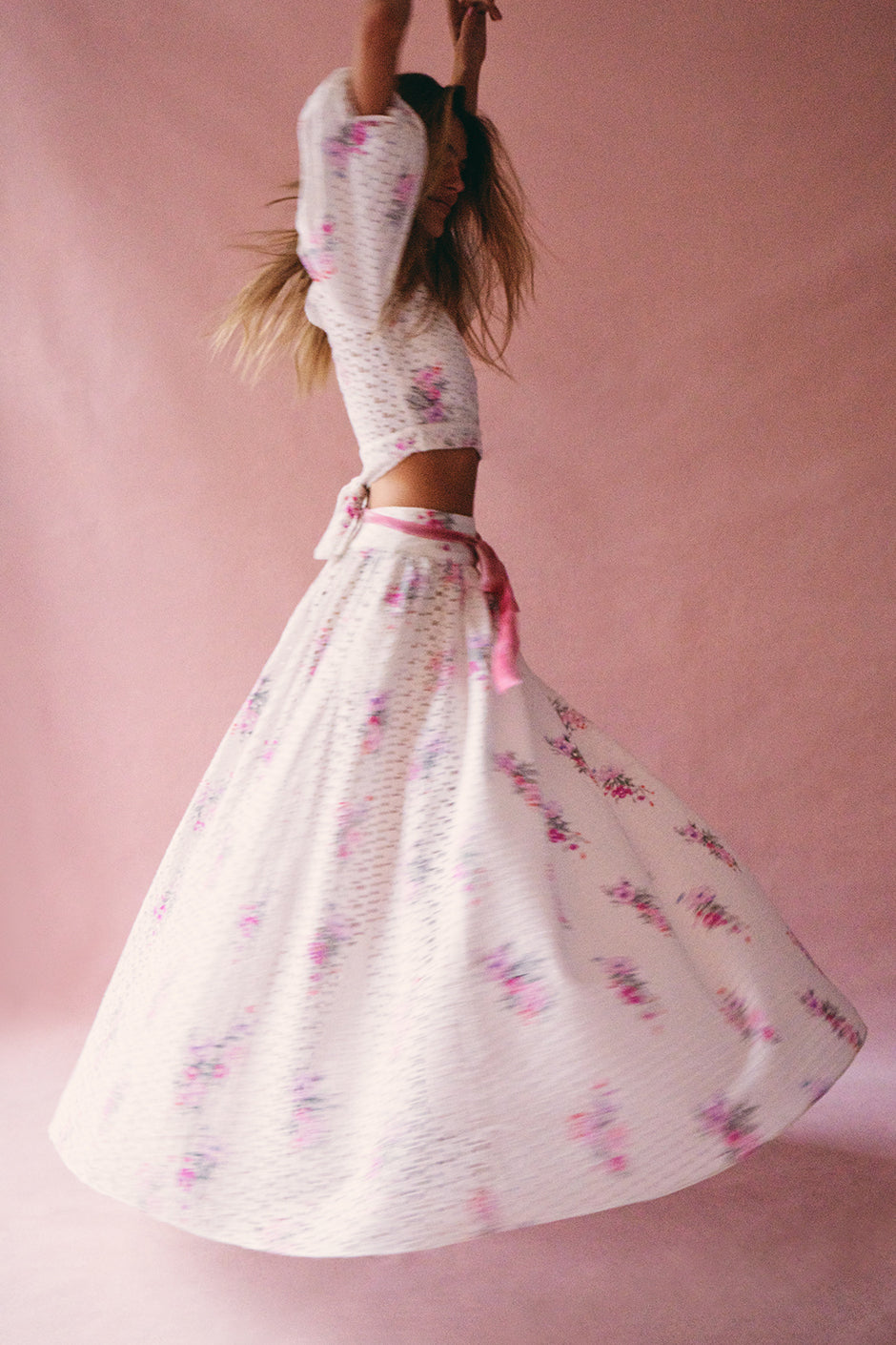 Dreamy, elevated pieces for summer excursions and endless days spent at the beach, inspired by the vibrancy and beauty of summers in Europe. Burnout printed chiffon and washed silk habotai fabrics on flirty, summer party dresses alongside dreamy embellishments like rhinestones and sequins. Intricate lace, shimmering silks, sun-soaked linen, heritage florals, elevated crochet, and sweater separates meant for summer dreaming.