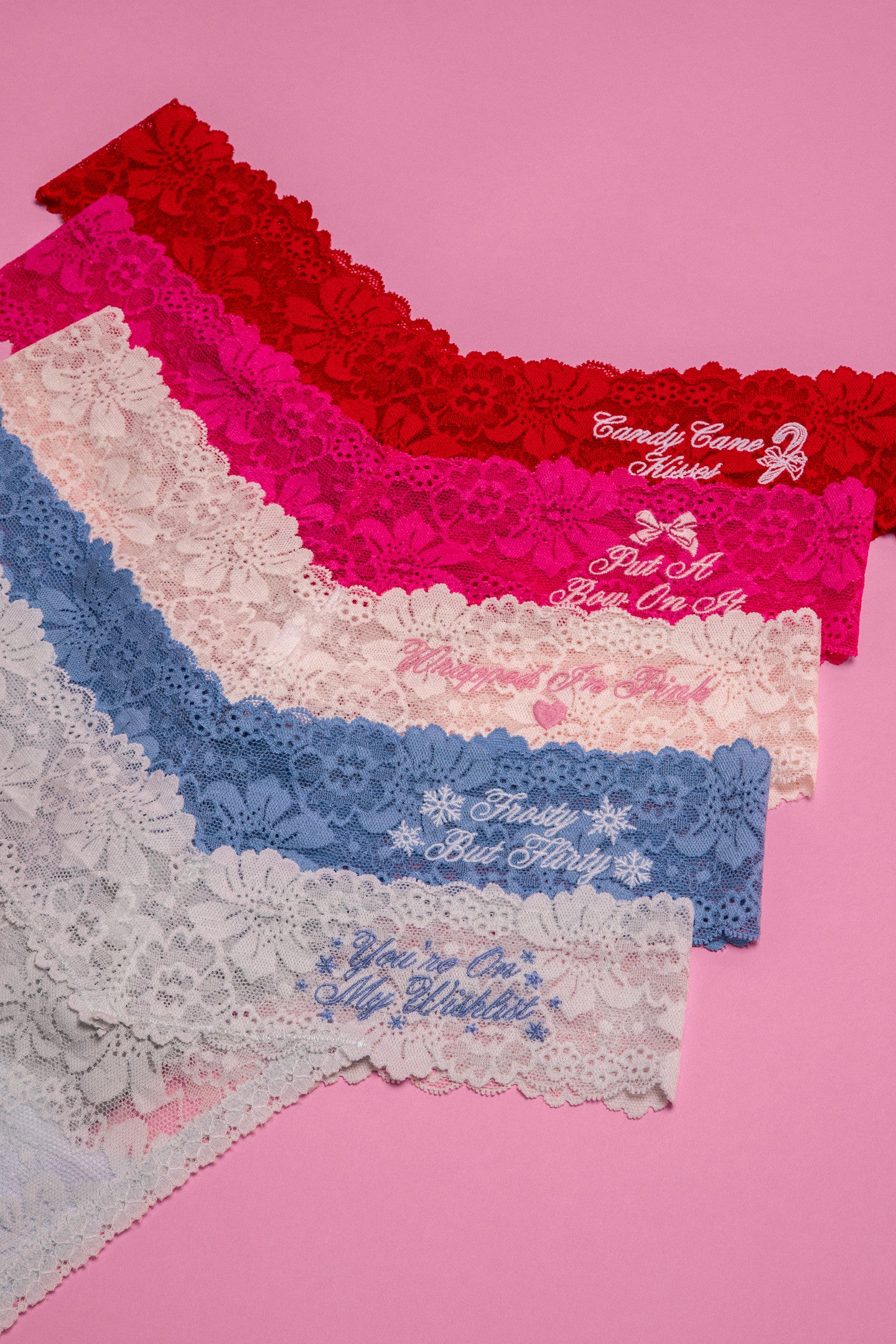 - Sayings include: You’re On My Wishlist, Frosty But Flirty, Wrapped In Pink, Put A Bow On It, Candy Cane Kisses