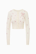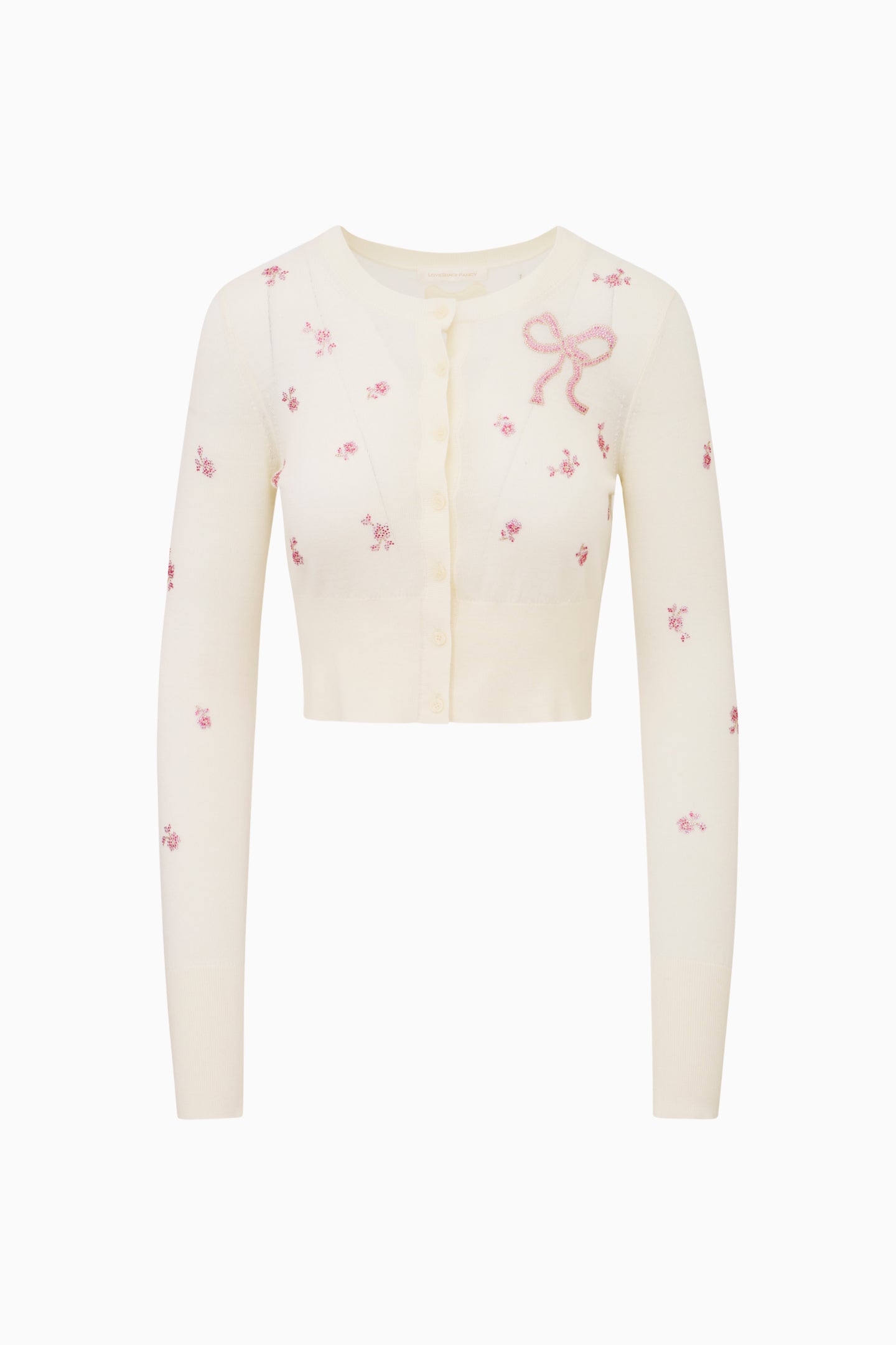 Our best-selling Adeanne Cardigan returns as part of our Secret Crush capsule. Designed from a luxe, soft Merino wool fabric, this must-have knit is the perfect layer for the cold weather season. Reimagined for this capsule, the sweater stuns with rhinestone-studded details taking the shape of our signature Coquette Bow and small flowers all over.