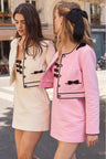 Sophistication meets femininity in the Adelaide Dress. This mod party dress arrives in a crisp, tweed fabric and a flattering silhouette. The A-line mini begins with spaghetti straps that fall to a keyhole detail highlighted by dainty, flirty bows at center front. She’s our new favorite party dress.