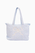 Our Aja Weekender is a LoveShackFancy favorite, reimagined in a lattice bow print. This sizable duffle is quilted and soft with spacious construction, interior pockets and a zipper closure at top.