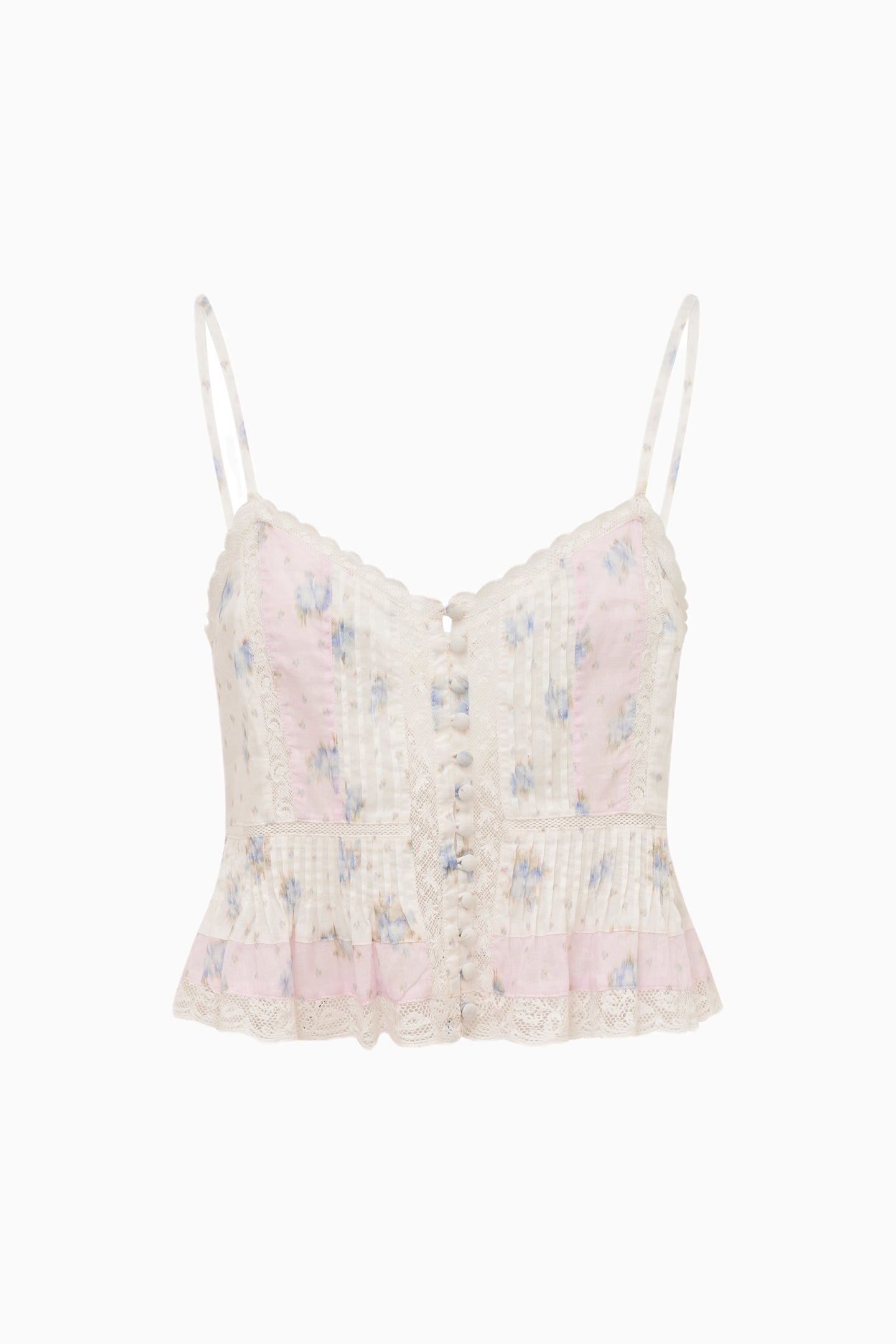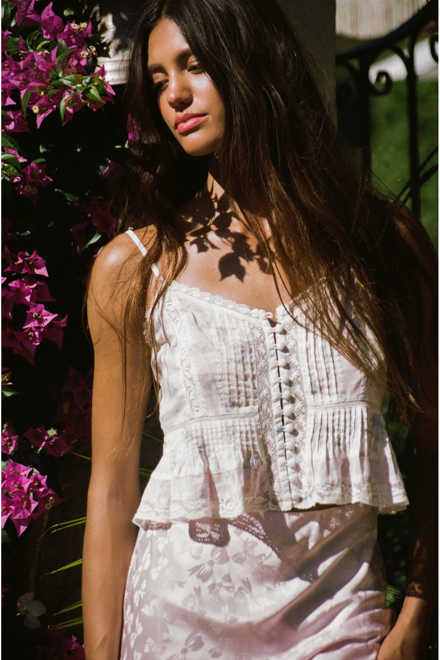 The Aleni Top is a breezy warm-weather cami designed in lightweight tissue voile with an ikat-inspired floral. This effortless button-down silhouette features delicate pintucks and lace striping throughout, a soft peplum hem for a romantic touch, and adjustable spaghetti straps for an easy, customizable fit. Finished with self-covered buttons and elastic loops, Aleni pairs perfectly with the matching Gloriana Skirt for a dreamy vacation set.