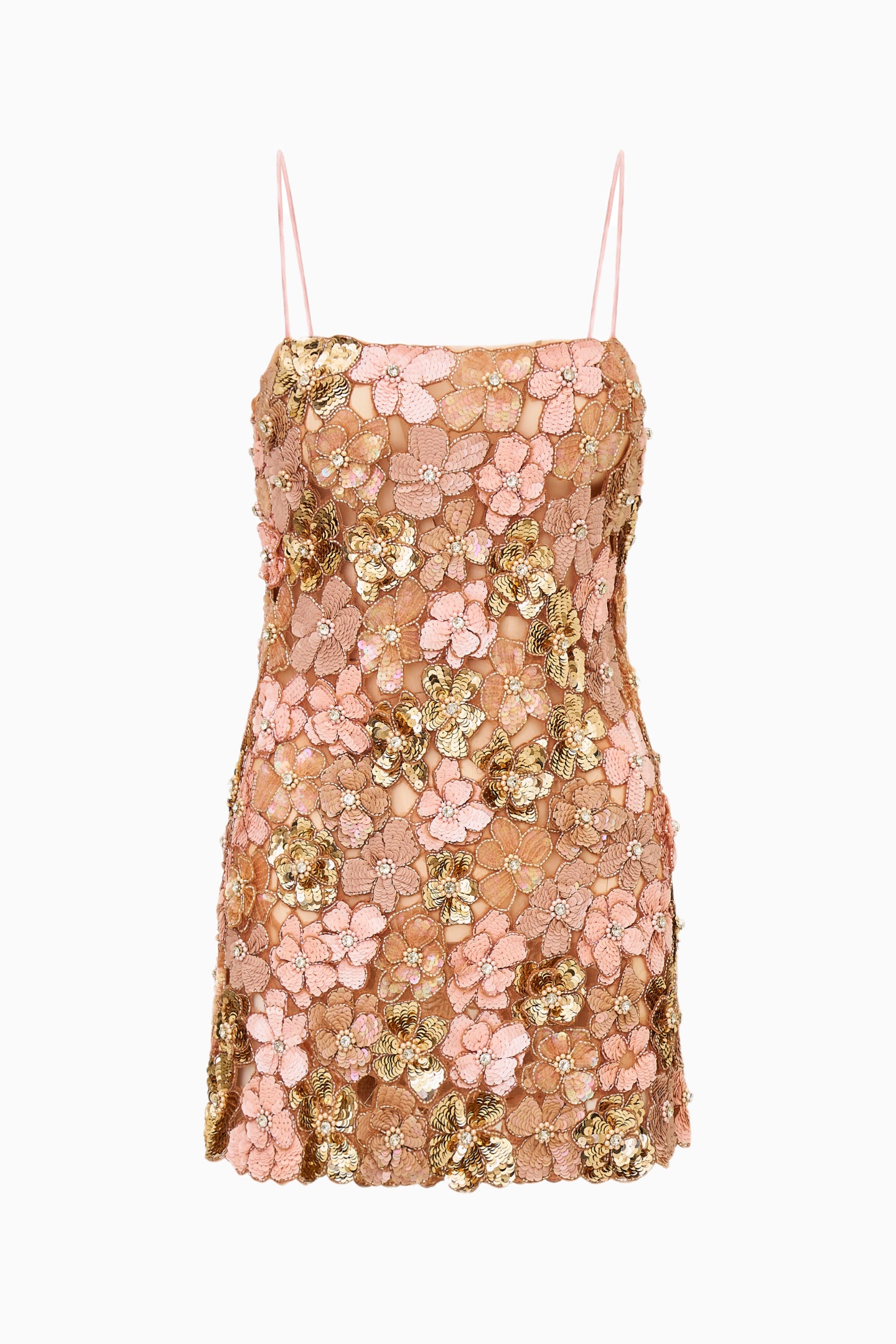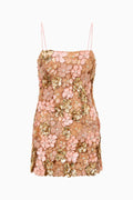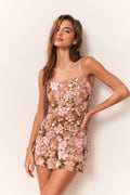 The Aleria Dress is a hand-crafted celebration of sequins, crystals, and 3D flowers. Each mini is adorned with a mosaic of iridescent blooms and pink-toned petals, layered over a crinkly chiffon lining for texture and movement. Cut to skim the body, it features delicate spaghetti straps with rhinestone accents and a hidden back zipper, making it a party-perfect piece for special events and festive nights.