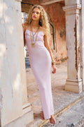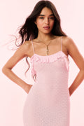Elevate your wardrobe with the Alivia Dress. This feminine dress makes its arrival in a lightweight stretch yarn with delicate pointelle stitch all over. With a slim-fitting silhouette, the flirty midi begins with thin spaghetti straps above a ruffle-adorned neckline that falls to the body-skimming skirt. The dress is slightly sheer giving it a sexy finish.