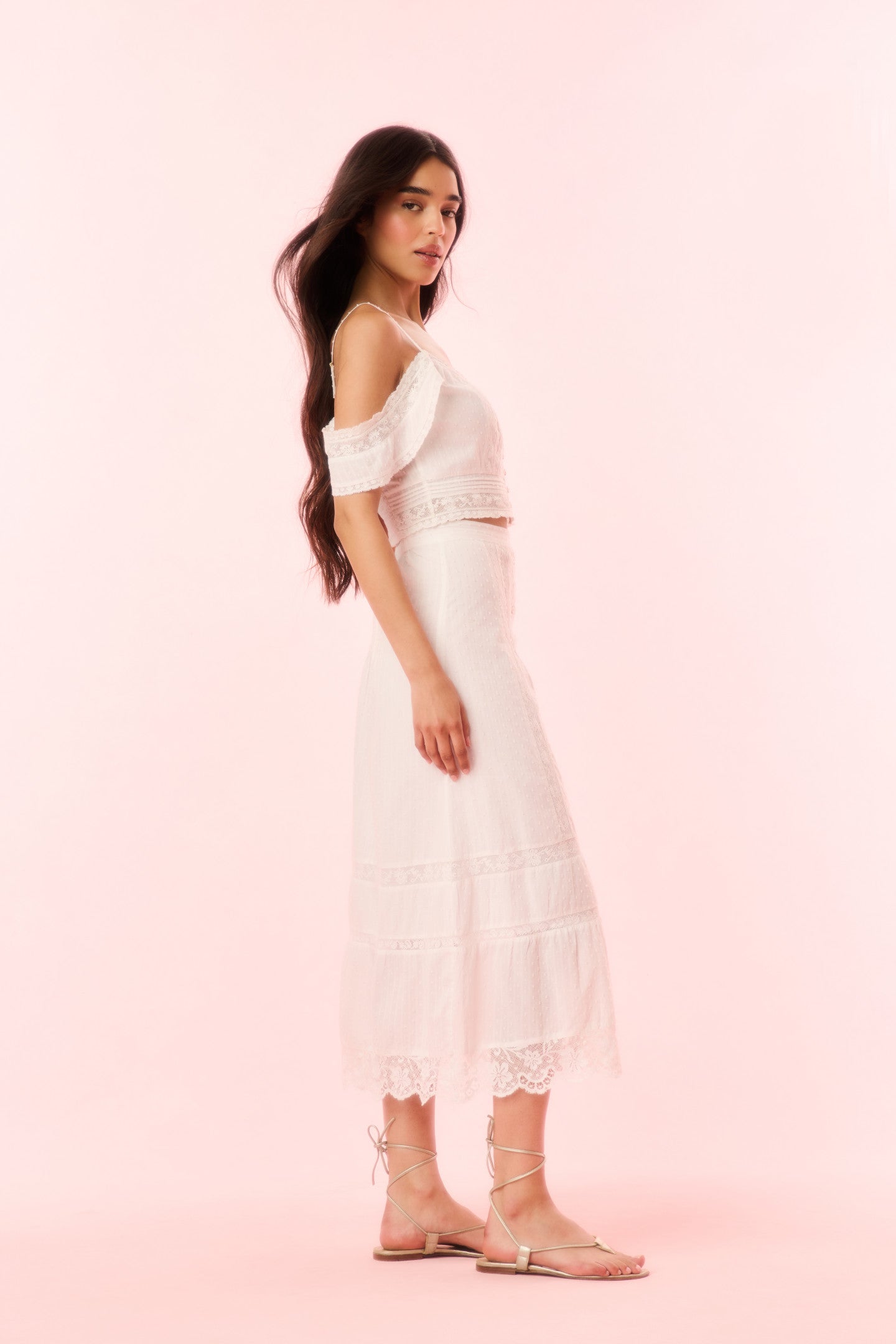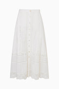 This charming midi skirt debuts with a cotton fabric adorned with vintage-inspired laces and embroideries, Victorian-inspired tucks with delicate trims all over. The pull-on piece features an A-line shape, a faux button down center front placket, and elastication at the back and the waist.