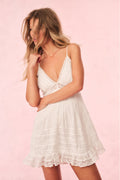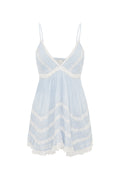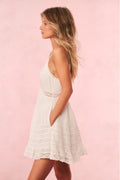 Feeling sweet in the Alonna Dress. This Victorian-inspired dress stuns with a lightweight cotton voile fabric and a contrast of white laces throughout. This strappy, v-neck mini features an empire waist that releases into a slight handkerchief hem skirt. There’s smocking at the back for ease and comfort, tucking at the waist, and includes pockets.