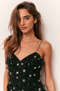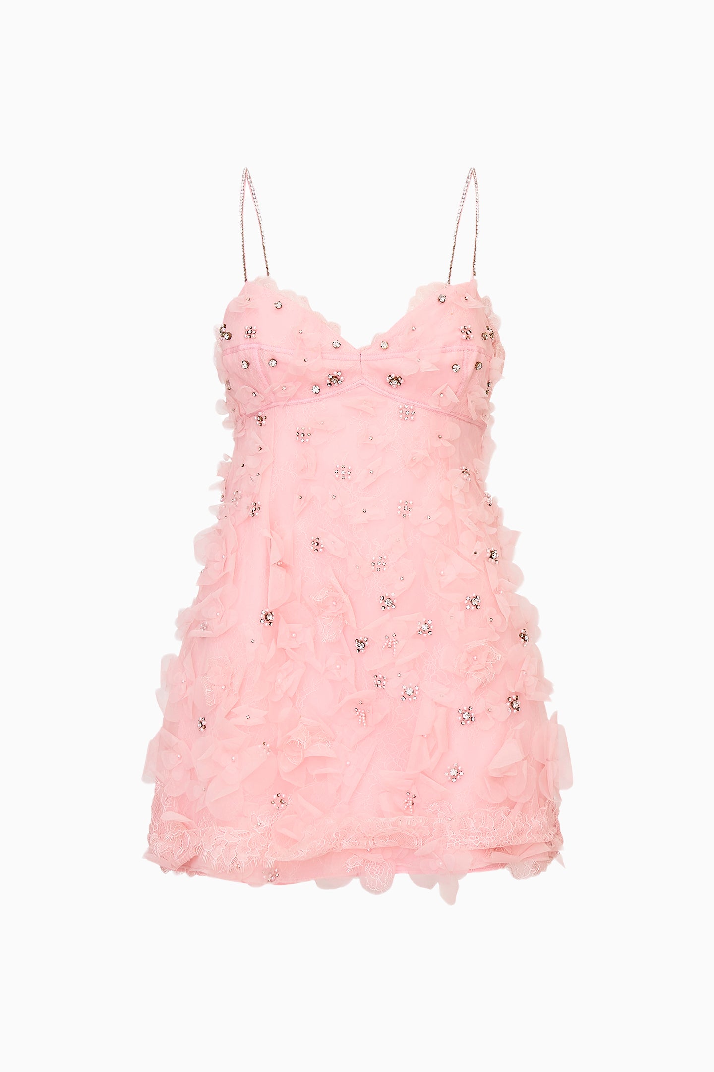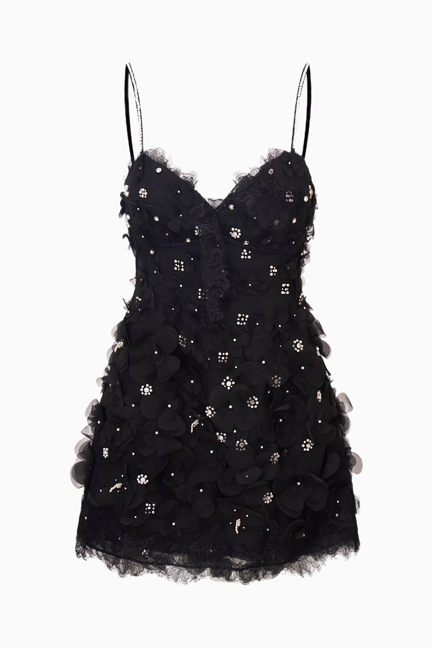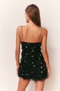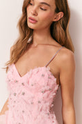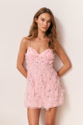 The Ambessa Dress is a flirty, party-ready mini crafted in lightweight polyester with a structural organza overlay. Designed for soirees and special occasions, it features an open neckline with delicate crystal spaghetti straps and intricate organza flowers adorned with pearls and rhinestones. The playful, feminine silhouette captures movement and charm, making Ambessa the perfect statement dress for any celebration.