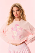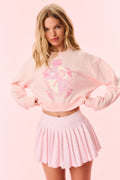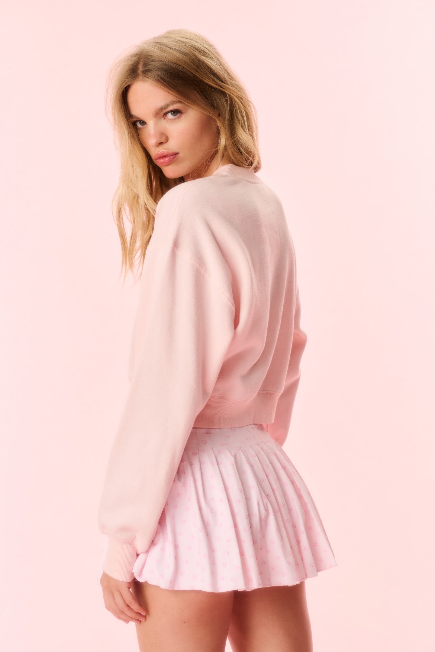 Cozy and cute in the Aneria Pullover. This easy layer arrives in our best-selling, ultra-soft brushback fleece fabric featuring rib trims at the neckline, hem, and sleeve cuffs. The pullover is finished with our printed LoveShackFancy tennis crest.
