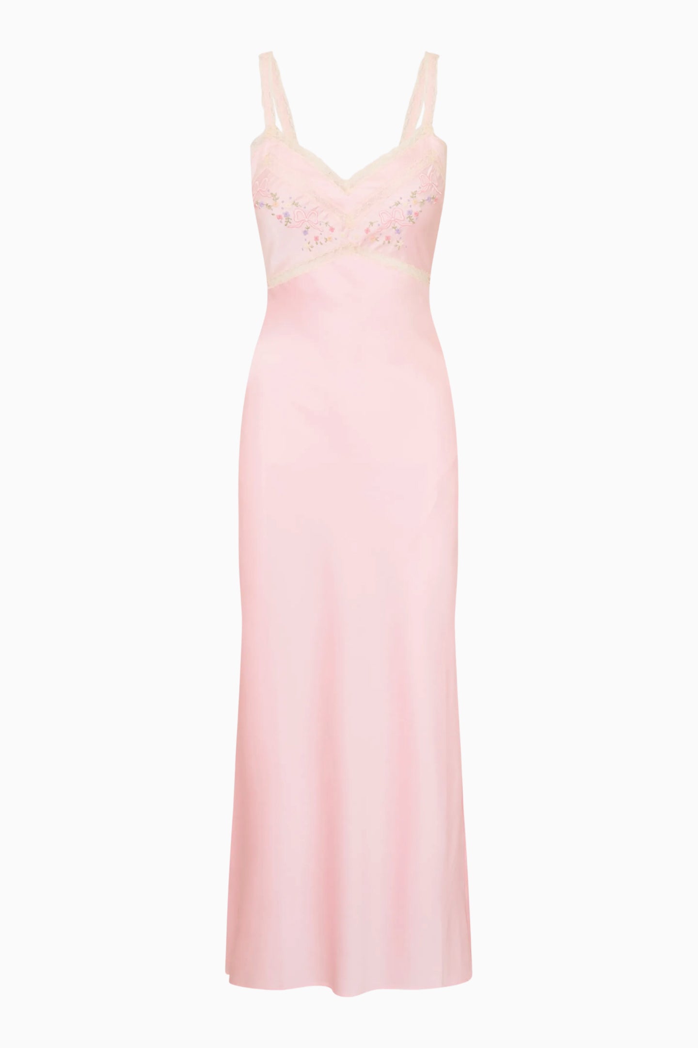 Sweeping and sophisticated, our Annabeth Satin Midi Dress features a regular fit and a curved hem that skims the figure with quiet ease. A V-neckline and slender spaghetti straps frame the shoulders with understated refinement, while a pastel flower print adds a wash of gentle color. A smooth, uninterrupted line from top to hem makes it a graceful choice for evening.