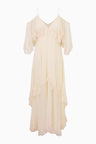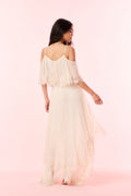 Introducing the Annavelle Dress. This Bohemian-inspired evening dress debuts with a diaphanous silk chiffon fabric mixed with vintage-inspired laces. The romantic off-the-shoulder gown features an ethereal and feminine silhouette with a cape-inspired bodice, ever-flowing ruffles adorning the shoulders, and a beautiful two-tiered skirt. She’s a must for your next big event.