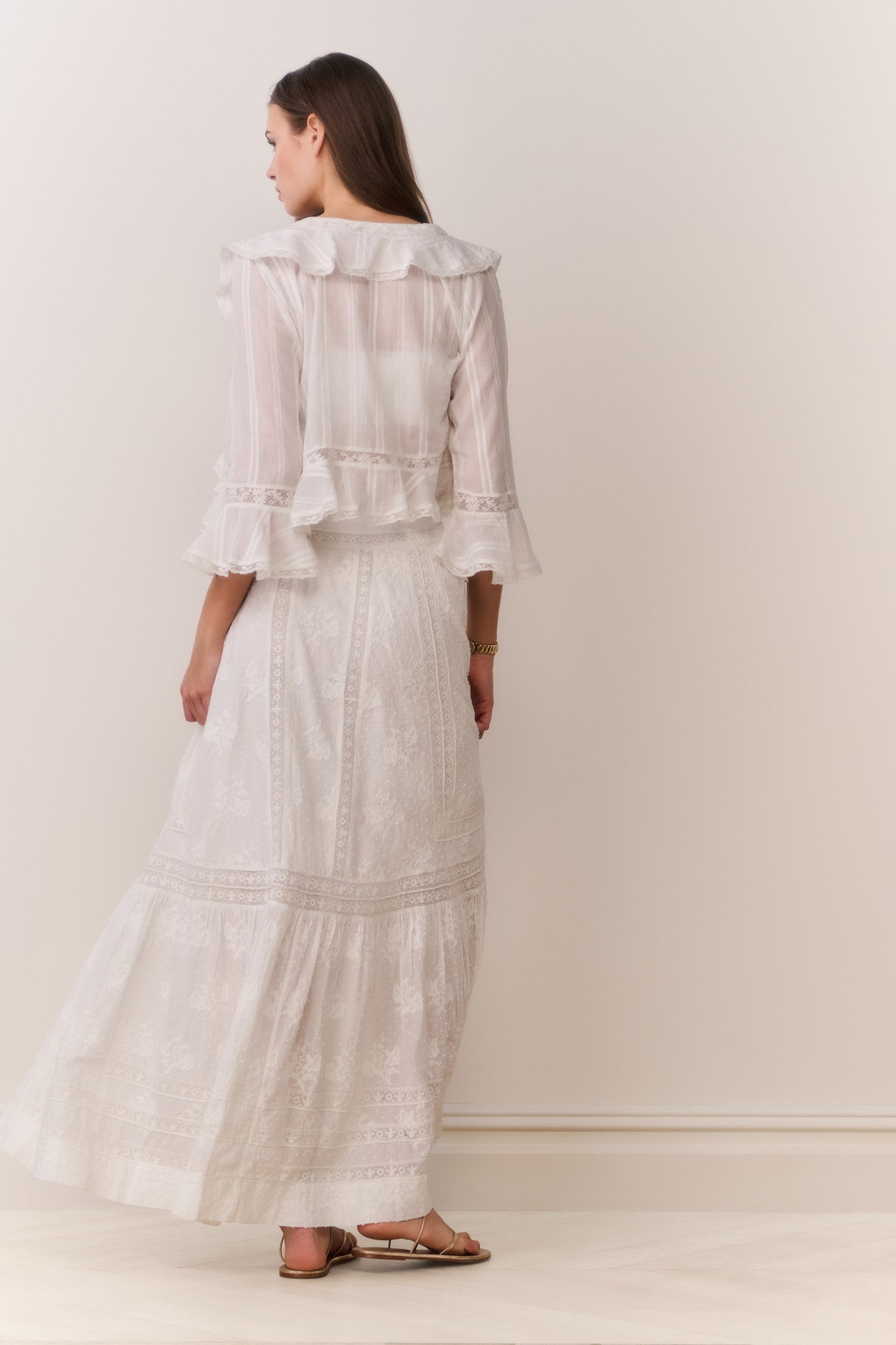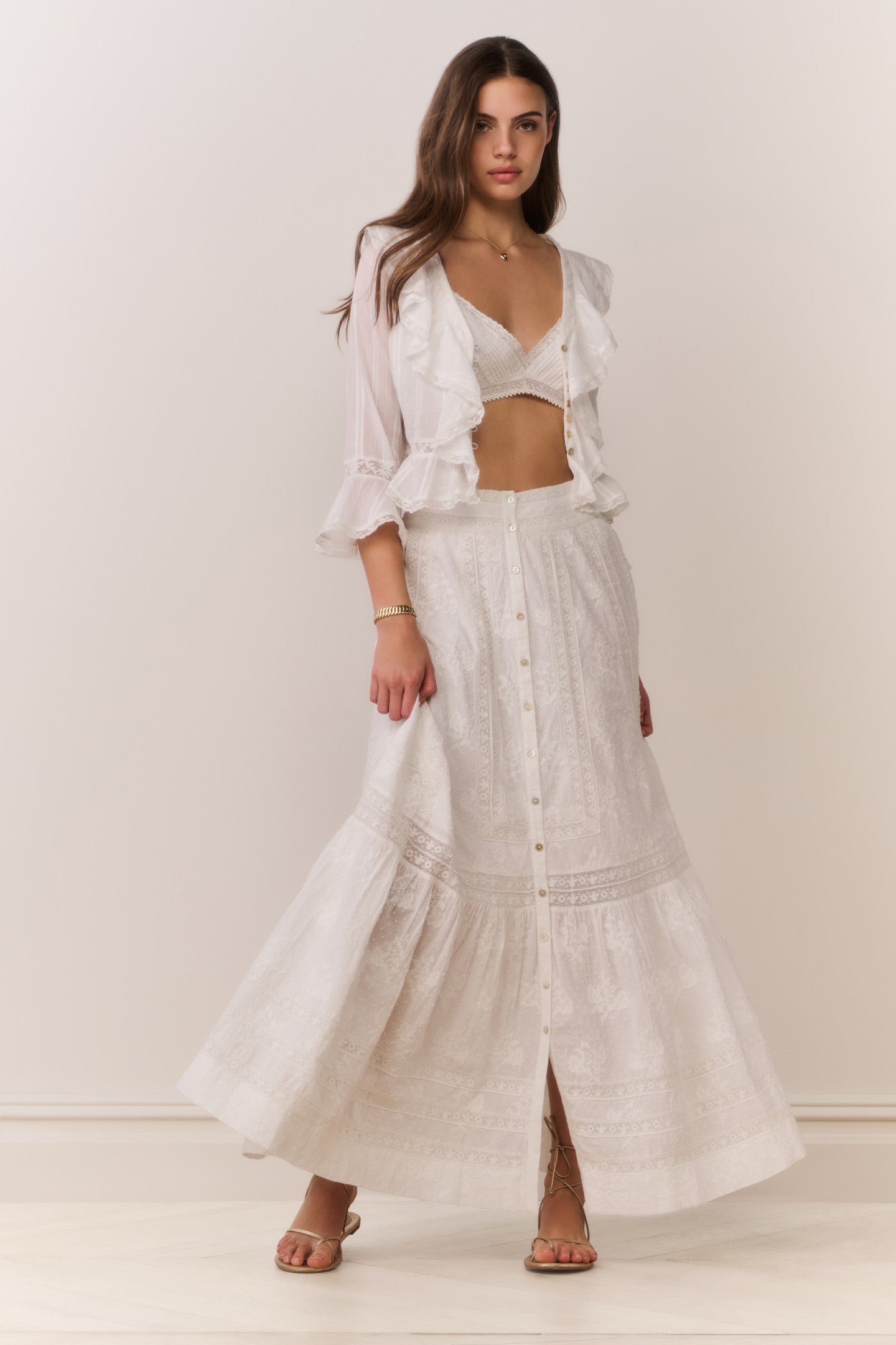 The Araminta Skirt exudes elegance with its flowing maxi length and paneled A-line construction. Detailed with sheer lace panels and eyelet insets, this high-rise skirt features a functional button-down placket.