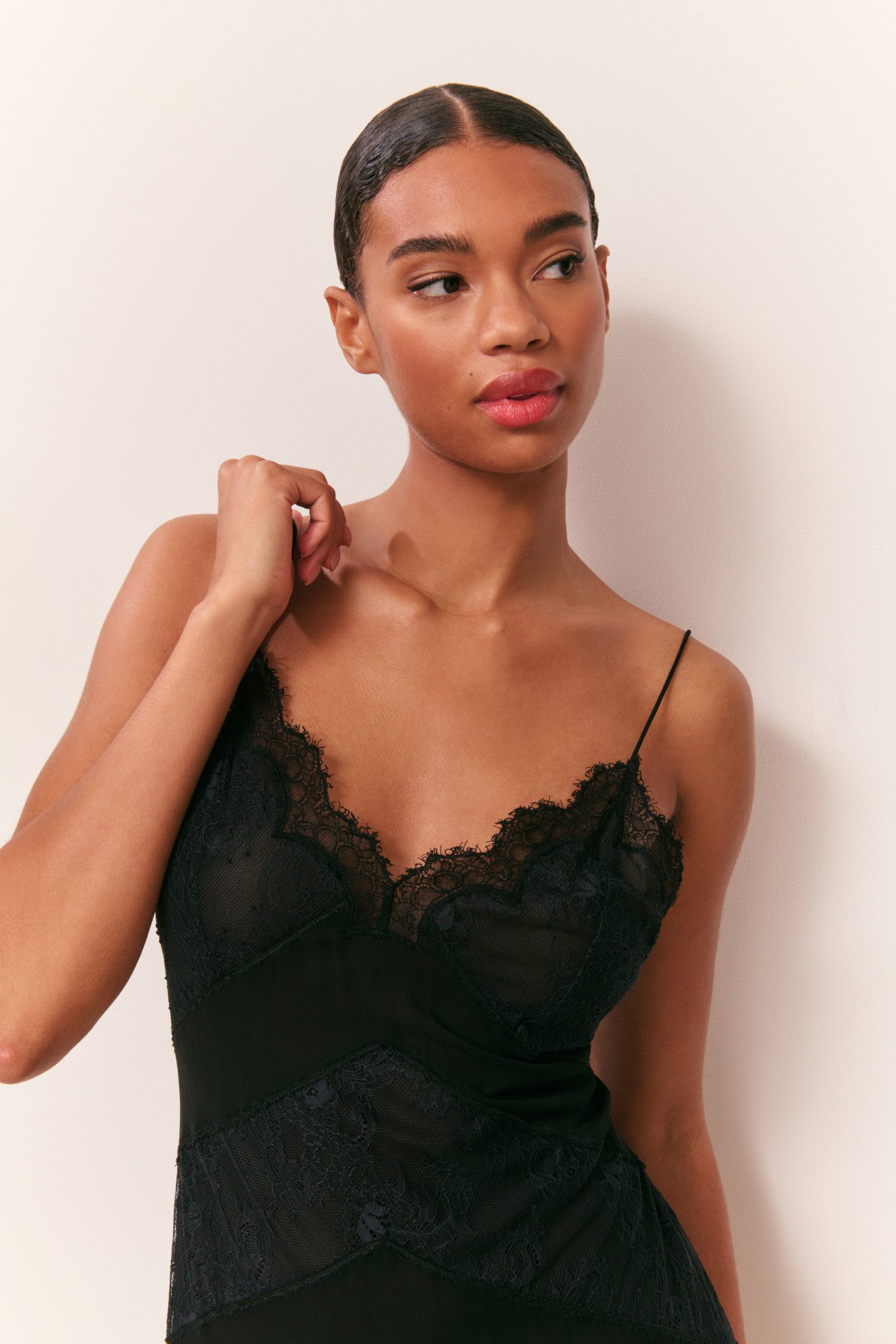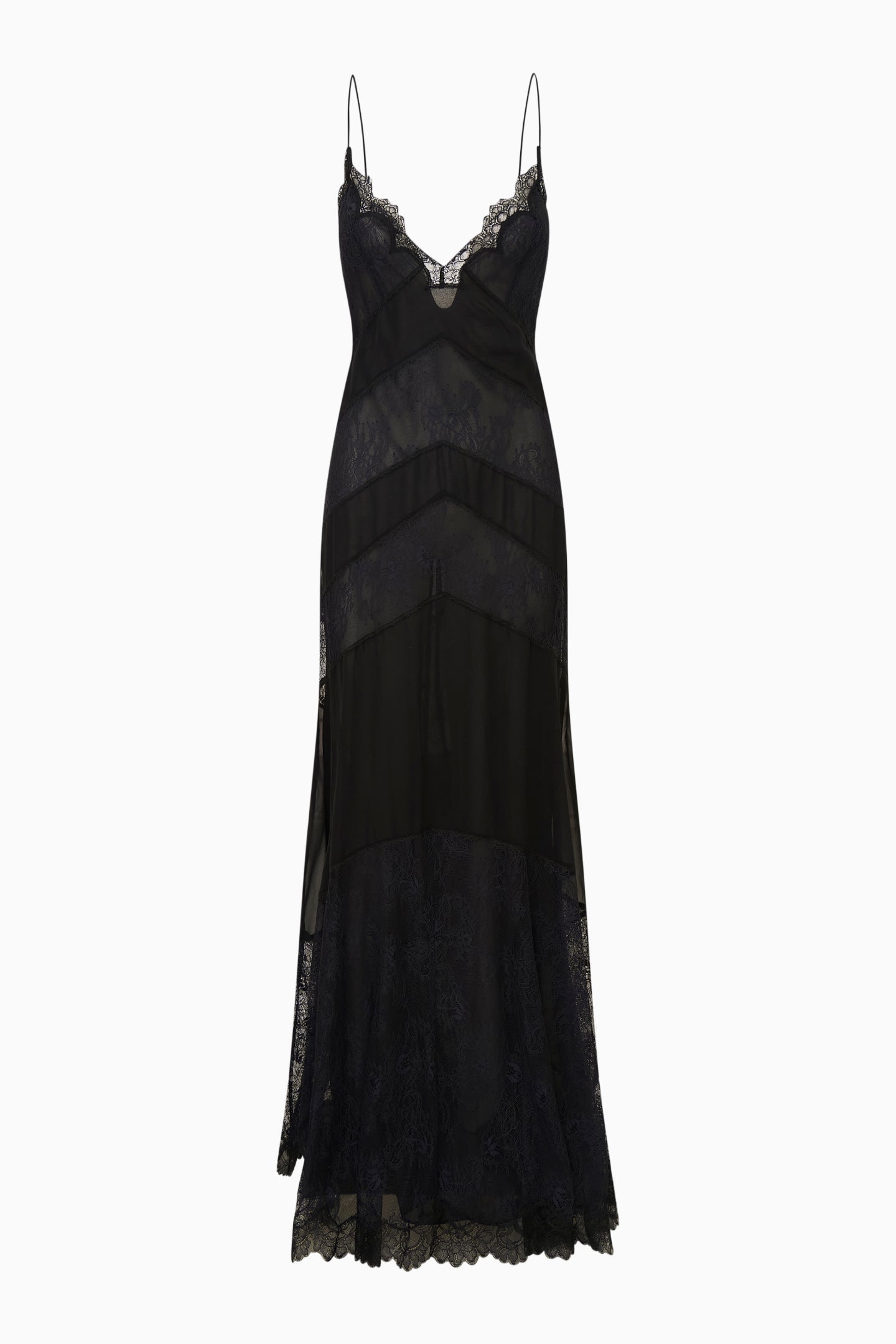 The Astra Dress is a captivating black maxi that blends romance with modern sophistication. Crafted from a chiffon lace fabric, it features wide lace panels and soft chiffon that gently reveal the skin beneath, creating a delicate, lingerie-inspired effect. A scalloped cut-out neckline and slender spaghetti straps add a hint of flirtation, while the hidden zip closure ensures a seamless fit. Fully lined with lace, the Astra Dress moves effortlessly with the body, making it an unforgettable choice for evening affairs or special moments.