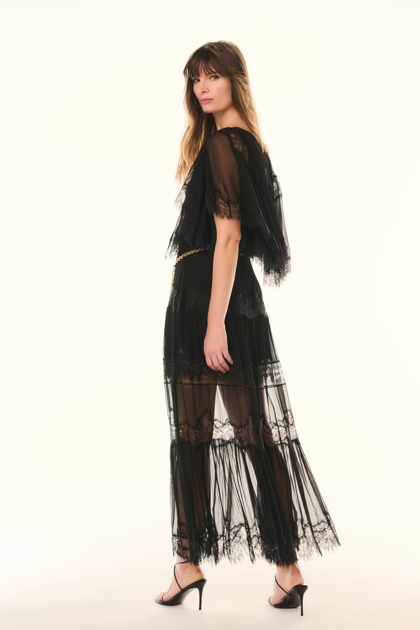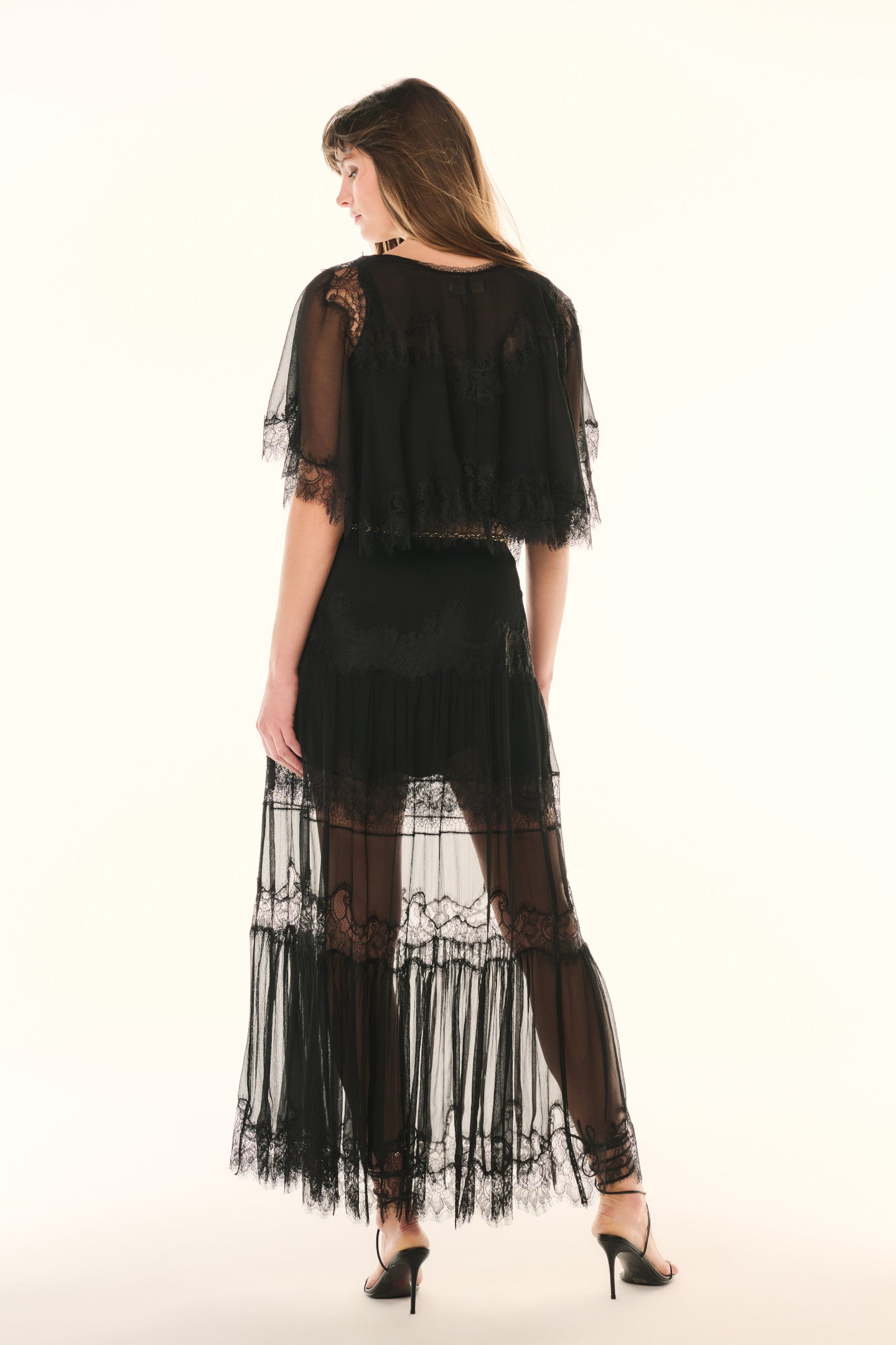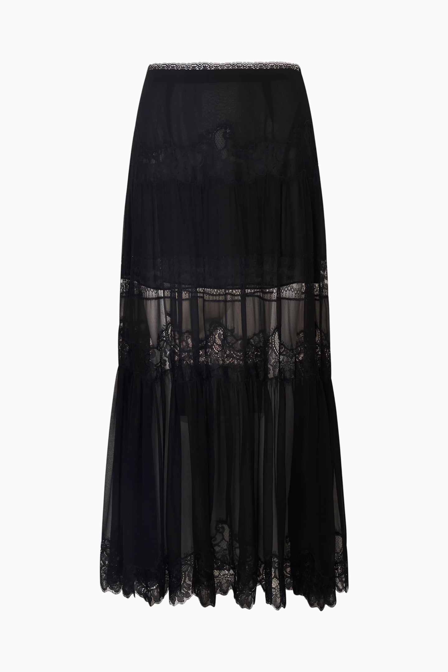 Our Aureline Silk Lace Pleated Maxi Skirt features a sheer pleated construction with a fitted high-rise waistband and three flowing tiers, each edged in delicate lace with a soft ruffled hem.