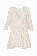 Introducing the Avaline Dress. This Bohemian-inspired piece debuts with a diaphanous chiffon fabric. The romantic mini features cape sleeves, a center back slit, ties at the neck opening and in the back for an elegant and feminine look.