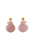 Swarovski crystals set in scallop shells hang from 24k antique gold plated flower toppers set with crystals on stainless steel hypoallergenic posts.