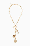 The necklace of our beach vacation dreams...a 24k antique gold plated chain adorned with authentic vintage shells rimmed in gold plating, a vintage fish charm, an antique gold plated brass coral branch, an antique gold plated scallop shell with genuine pearl and a mother-of-pearl heart.