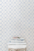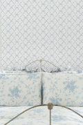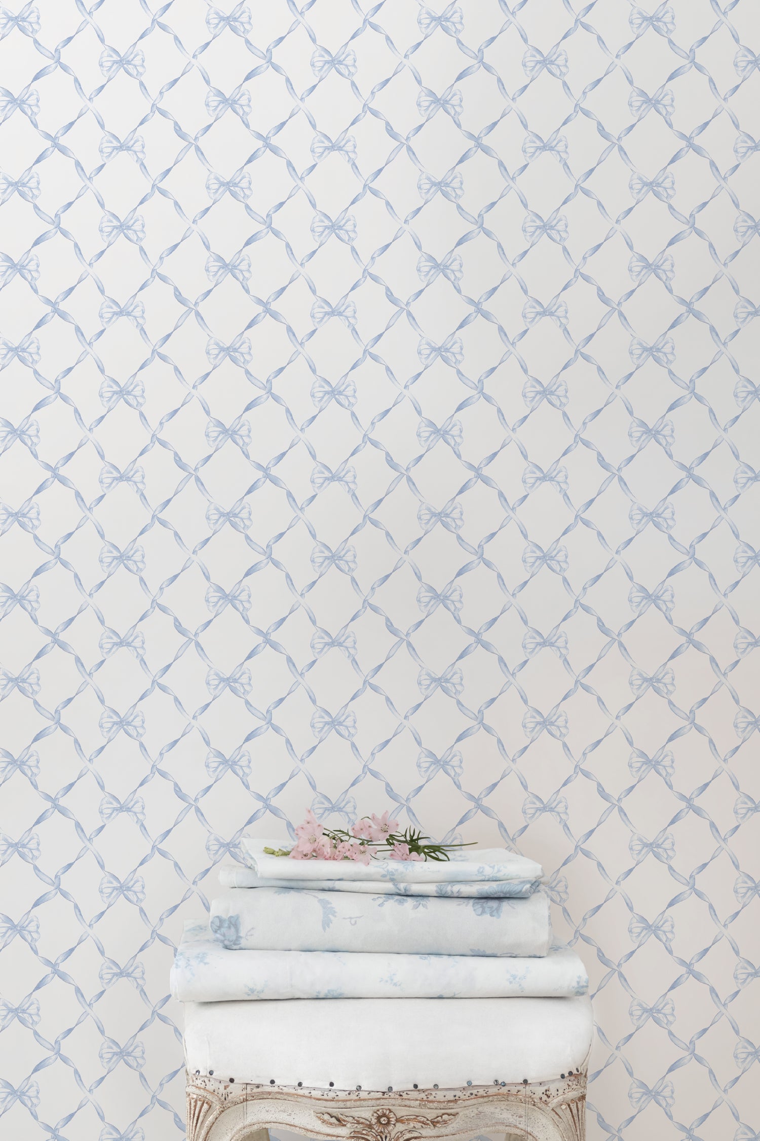 A long-standing LoveShackFancy favorite, the Baby Bow design is given new life as wallpaper! The soft blue ribbon forms a woven diamond trellis connected by looping bows. Each roll measures 20.5” x 33'.