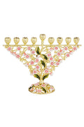 From the Bella Collection. Olivia Riegel's Bella menorah is adorned with a charming floral motif crafted from gold-finished pewter, featuring pink and green hand-enameling and sparkling European crystals for a touch of elegance. This exquisite menorah not only exudes beauty but also boasts tarnish-resistant properties, ensuring its longevity as a stunning centerpiece for Hanukkah celebrations.