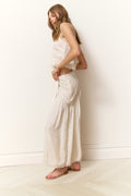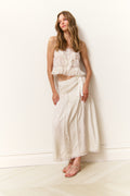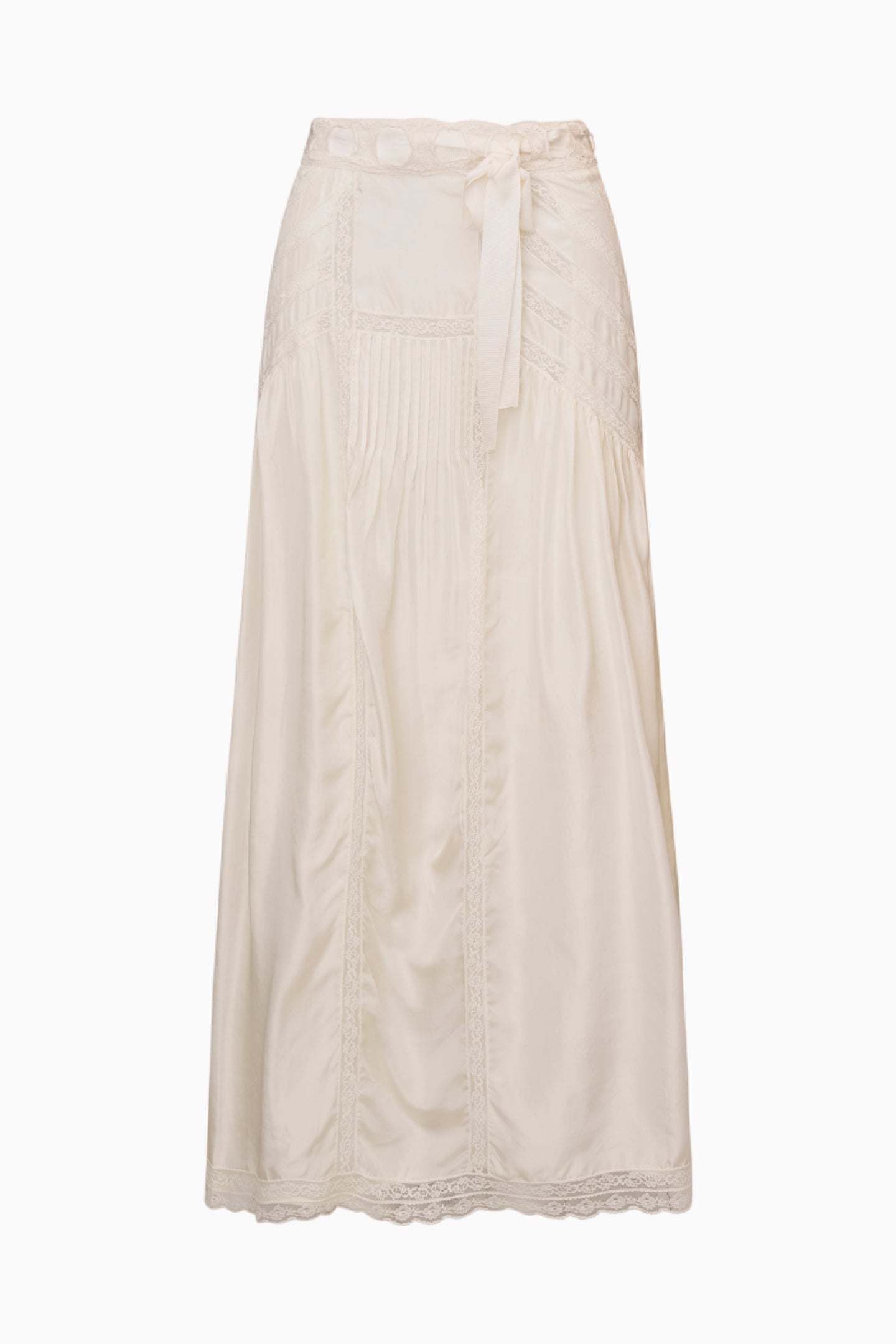 Introducing the Beloria Skirt. Designed from a luxe, silk habotai fabric, this pretty Victorian-inspired maxi stuns with intricate laces and pintucking details throughout, a ribbon threaded through lace at the waist, a body-hugging fit at the hip that releases slightly into a modest A-line skirt. The piece is finished with a zipper.
