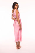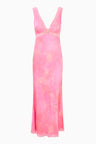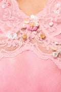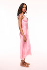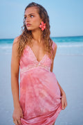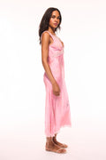 Introducing the Bier Dress. This gorgeous slip dress stuns with a solid charmeuse silk blend fabric with a hand-dyed-like print all over. The midi dress features vintage-inspired laces at the neckline and hem adorned with shell-and-pearl embellishments.