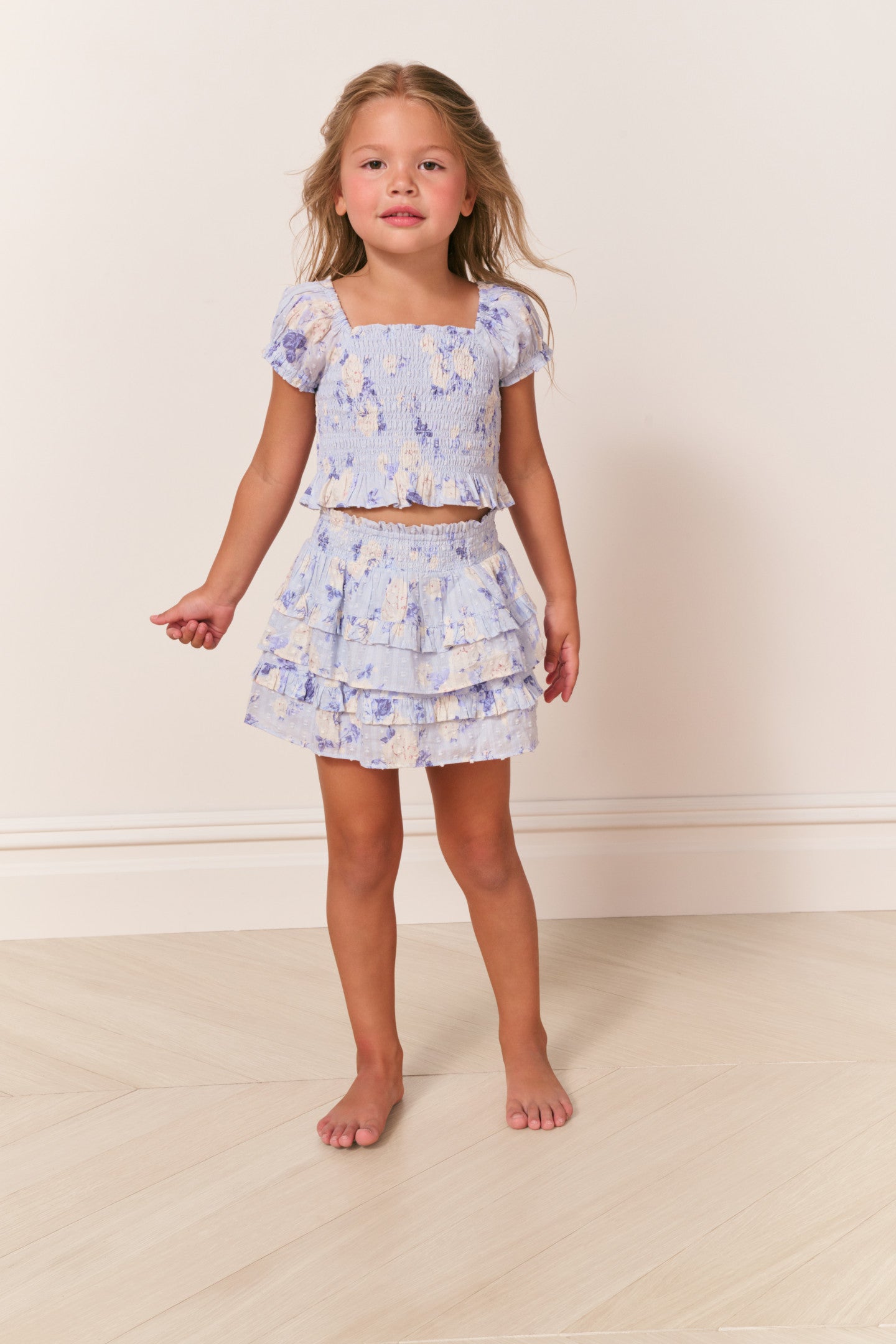 Our beloved Billie Skirt returns as part of our Heirloom Print Capsule collection featuring our signature fragrance prints. Below a wide smocked waistband, the skirt falls to two shirred tiers with ruffle details.