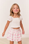 Meet our beloved Billie Skirt in 100% cotton. Below a wide smocked waistband, the skirt falls to two shirred tiers with ruffle details.