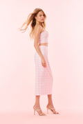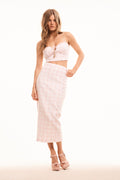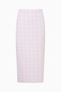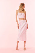 Pretty in pink in the Biselle Skirt. This charming midi debuts with a crisp linen fabric featuring a coastal gingham print all over. With a fixed waist, the pencil skirt has a center back slit and a flattering, form-fitting silhouette. Pair with the Amorana Top for the full set.