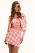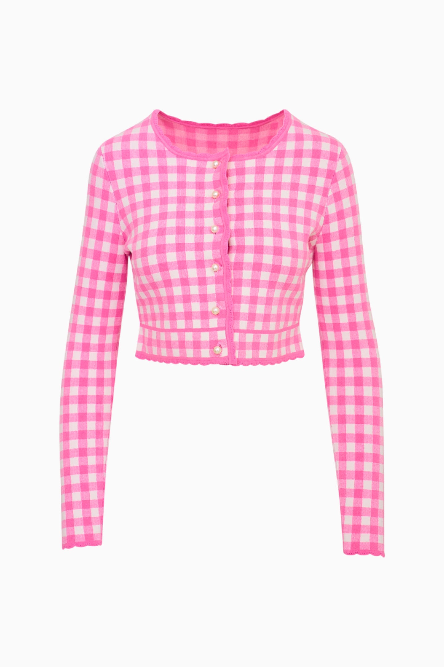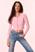 Introducing the Bridgette Cardigan. This lightweight gingham knit arrives in our best-selling stretch yarn with a delicate pointelle throughout. Extra cozy and cute, this cardigan has a flattering, slim-fitting silhouette that’s slightly cropped. The piece begins with a crew scoopneck above a center front placket with round pearl buttons. A chic scallop detail adorns the neckline, cuffs, and the hem for a preppy finish. Pair with the Muna Skirt or over the Jessyn tank for a full set.