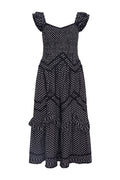 Our best-selling Brin Dress is back for the season. Designed from an easy, cotton dobby striped fabric, with a subtle stripe texture, the midi features beautiful small top-applied ruffle details in a zigzag formation. This must-have dress features a smocked bodice throughout that releases at the high hip into a sweepy, dramatic skirt making it a dreamy, sophisticated party dress. The piece begins with sweet flutter sleeves with tiny ruffle trims, top-applied ruffle details at the bodice in a chevron design, and intricate top-applied ruffle details at the skirt.