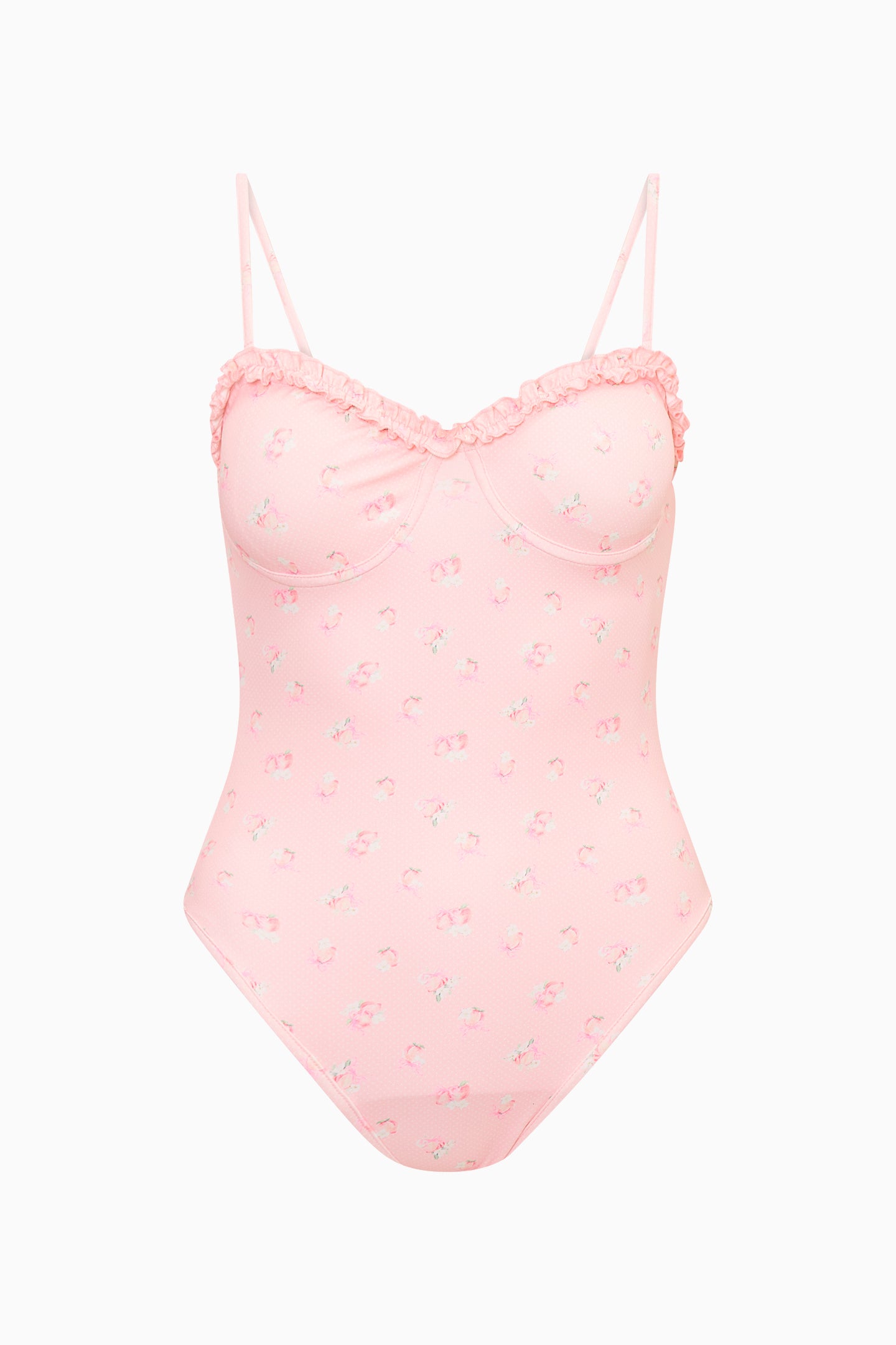 The Brooksie Swimsuit is a flattering one-piece elevated with ruffled detailing along the top edge and adjustable straps. Designed with supportive underwire and removable bra cups. Finished with a modern high-cut leg, this suit blends comfort, support, and a touch of romance for your next getaway.