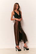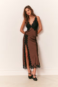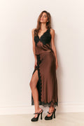 Flirty and feminine in the Calder Skirt. This bias slip skirt arrives with a satin charmeuse, drapey fabric with delicate chantilly lace trims. The boudoir-inspired midi features a flattering silhouette with sext trim down the thigh that opens into a slit. The piece is finished with lace trim at the hem. Pair with the Elloryn Top for the full set.