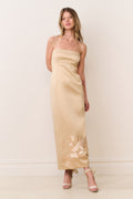 The Calise Dress is a body-skimming midi crafted from stretch satin, offering a smooth, flattering fit with just the right amount of give. Falling to mid-calf, it features a subtle back vent for ease of movement and a playful bow applique at the hem, combining elegance with a touch of whimsy. A hidden zipper ensures a seamless finish.