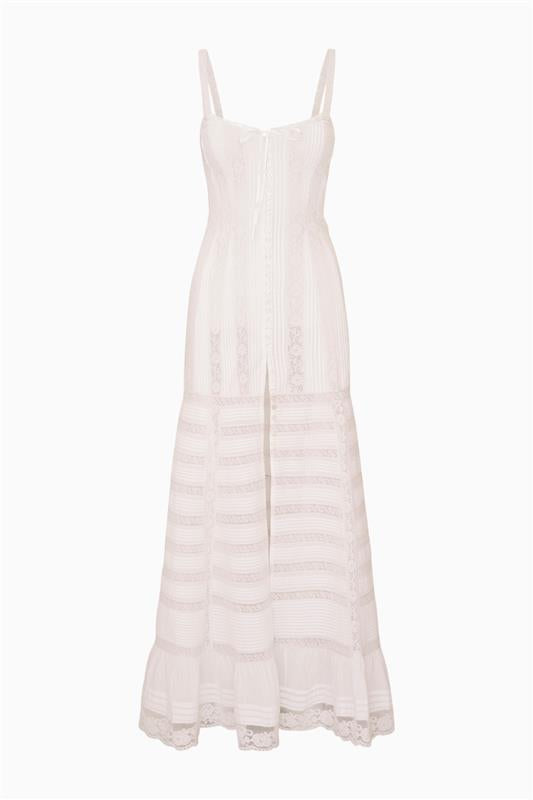 Fall in love with the Calyx Cotton Maxi Dress. This signature sheath silhouette is crafted from lightweight cotton, creating an effortlessly chic warm-weather look. Vertical lace insets cascade down the fitted bodice to a sweeping skirt, finished with lace trim at the hem and a center front slit for graceful movement.