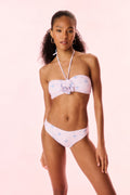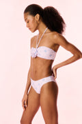 Effortlessly chic in the Candace Bikini. This sophisticated swimsuit stuns with removable rosettes on the center front of the top and at the hip of the bottoms. The top of the suit features a gold hardware hook-and-eye closure on the back and a self tie for around the neckline. The flattering bottoms hug your hips and provide easy and comfortable wear.