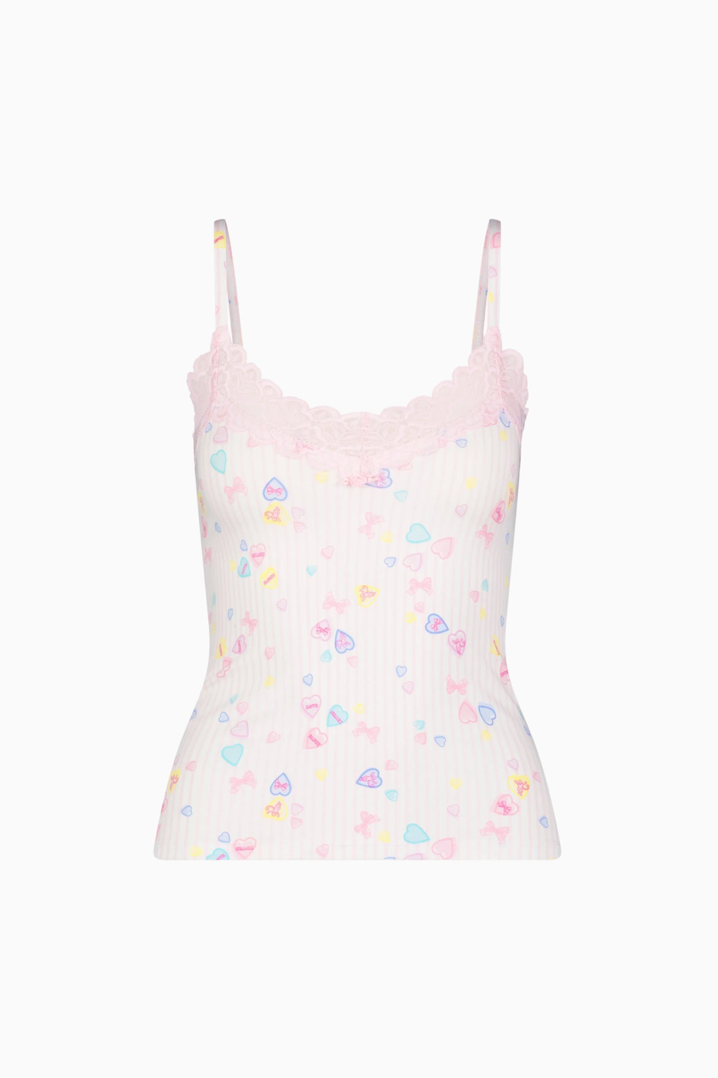 "Be mine," you'll say to this pretty-in-pink camisole, trimmed with pastel lace and dotted with a candy heart print. Pair it with the matching Jones Shortie for a set so sweetly romantic.