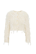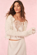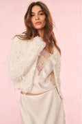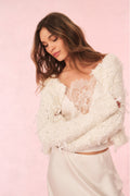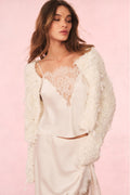 Feeling flirty and cozy in the Carol Cardigan. This dream knit debuts with stunning hand-dyed ribbons all over that have been hand-knit into a beautiful eyelash boucle yarn. The ribbons weave in and out of the fabric to create a playful, fringe effect. This must-have sweater is finished with our custom LoveShackFancy faux shell button with a bow motif.