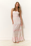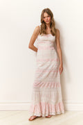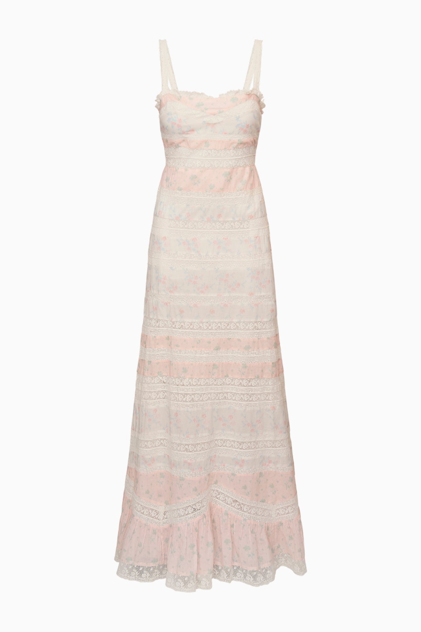 Effortlessly chic in the Carwen Dress. Designed from a cotton voile fabric, the Victorian-inspired maxi dress features a pretty printed lace and mixed print effect along with vintage-inspired laces stripped throughout. Beginning with lace straps, the flattering dress has smocking at the back bodice for ease and comfort and a slim, a-line skirt that falls to a sweepy flounce.