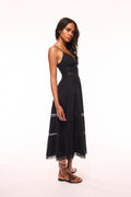 Easy breezy in the Catryn Dress. This chic midi is designed from a crisp, poplin cotton fabric stripped with intricate laces at the body, neck, and the full A-line skirt. The fit-to-flare style features a structural bodice and fixed waist for a flattering fit and silhouette. A lace bow detail sits at the center front alongside thin spaghetti straps, a scoop neckline, and an airy, sweeping skirt. This piece includes a side seam zipper.
