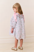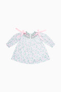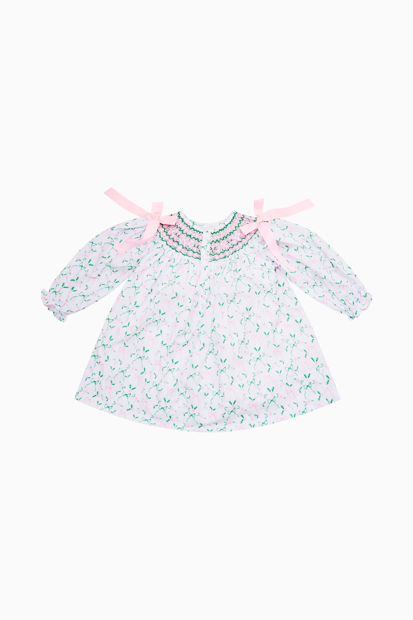 This sweet holiday dress features a festive bow and holly print, pink and green accents, and delicate smocking across the neckline. Finished with long sleeves and shoulder bows, it’s perfect for Christmas gatherings and seasonal photos.