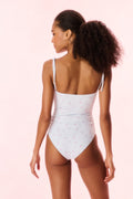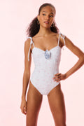 Introducing the Chamomile One Piece. The perfect swimsuit for your next vacay, this pretty one-piece features color blocking details with a dainty floral print all over.