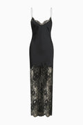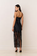 The Circe Dress arrives in a chic black colorway for the cold weather season. With a soft, satin-like fabric, the slip dress features thin spaghetti straps, beautiful chantilly lace details on the bust, a body-skimming silhouette, and a sheer, lace skirt.