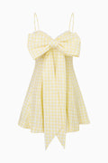 Sunshine ready in the Clarine Dress. The gorgeous mini dress arrives in a crisp linen fabric with a pretty gingham print all over. This piece begins with thin spaghetti straps above a sweetheart neckline that falls to an airy skirt and finishes with an oversized fixed bow. Because everything’s better with a bow.