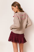 The Clementian Cardigan is a romantic layering piece, crafted in lightweight Pujpu yarn with a cozy blend of baby alpaca, nylon, and wool. This warm, soft cardigan evokes a fair isle-inspired look reimagined through intricate lace ribbon cables, with varied cable stitches tracing the yoke for texture and dimension. Satin ribbons woven around the neckline tie into bows at the princess seams, while custom shell buttons finish the piece with delicate detail. Feminine, textured, and effortlessly dreamy, Clementian is perfect for layering over skirts, dresses, or your favorite high-waist denim.