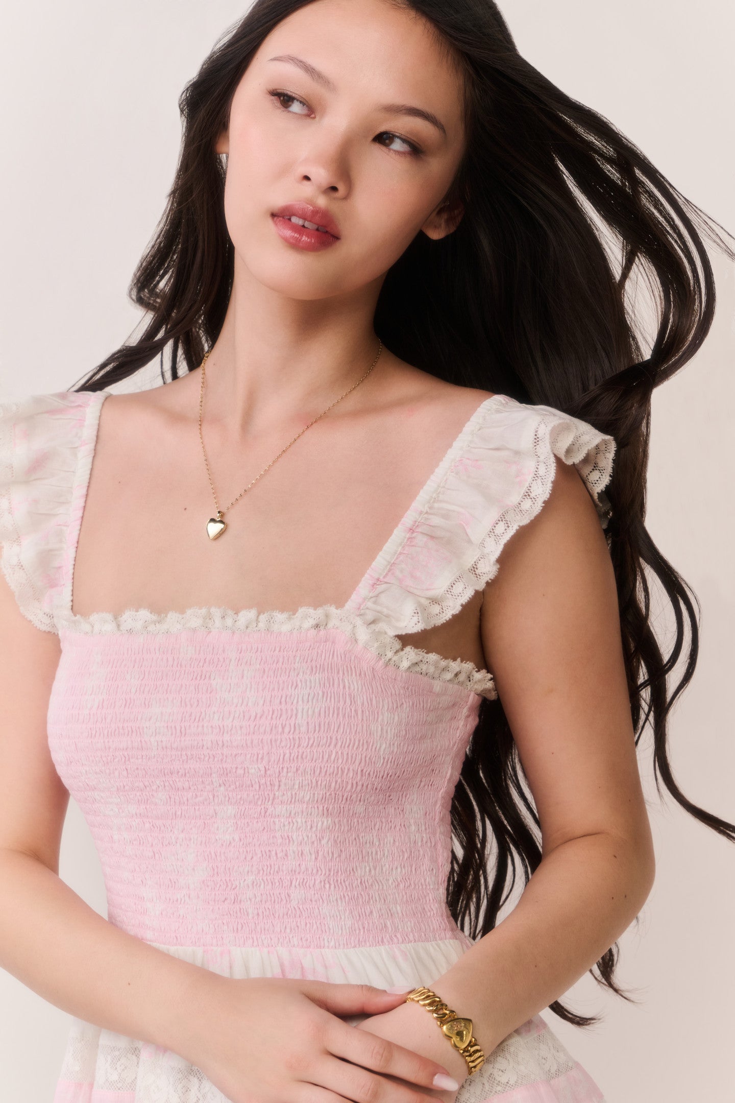 The Colbera Dress is crafted in a lightweight cotton fabric that floats with every movement. A square neckline defines the smocked bodice, complemented by short, fluttery ruffle sleeves. Horizontal lace insets and an eyelet-tiered ruffle skirt add delicate contrast and whimsical dimension.