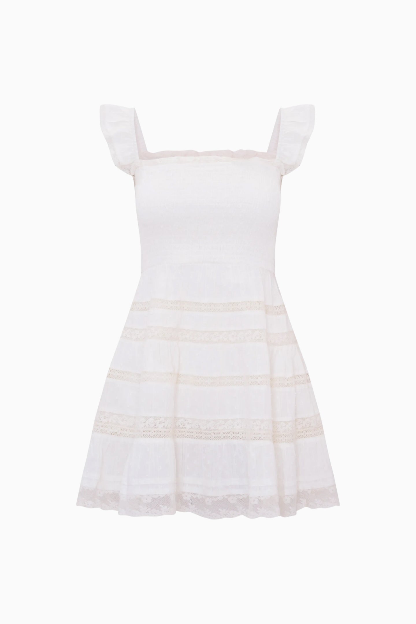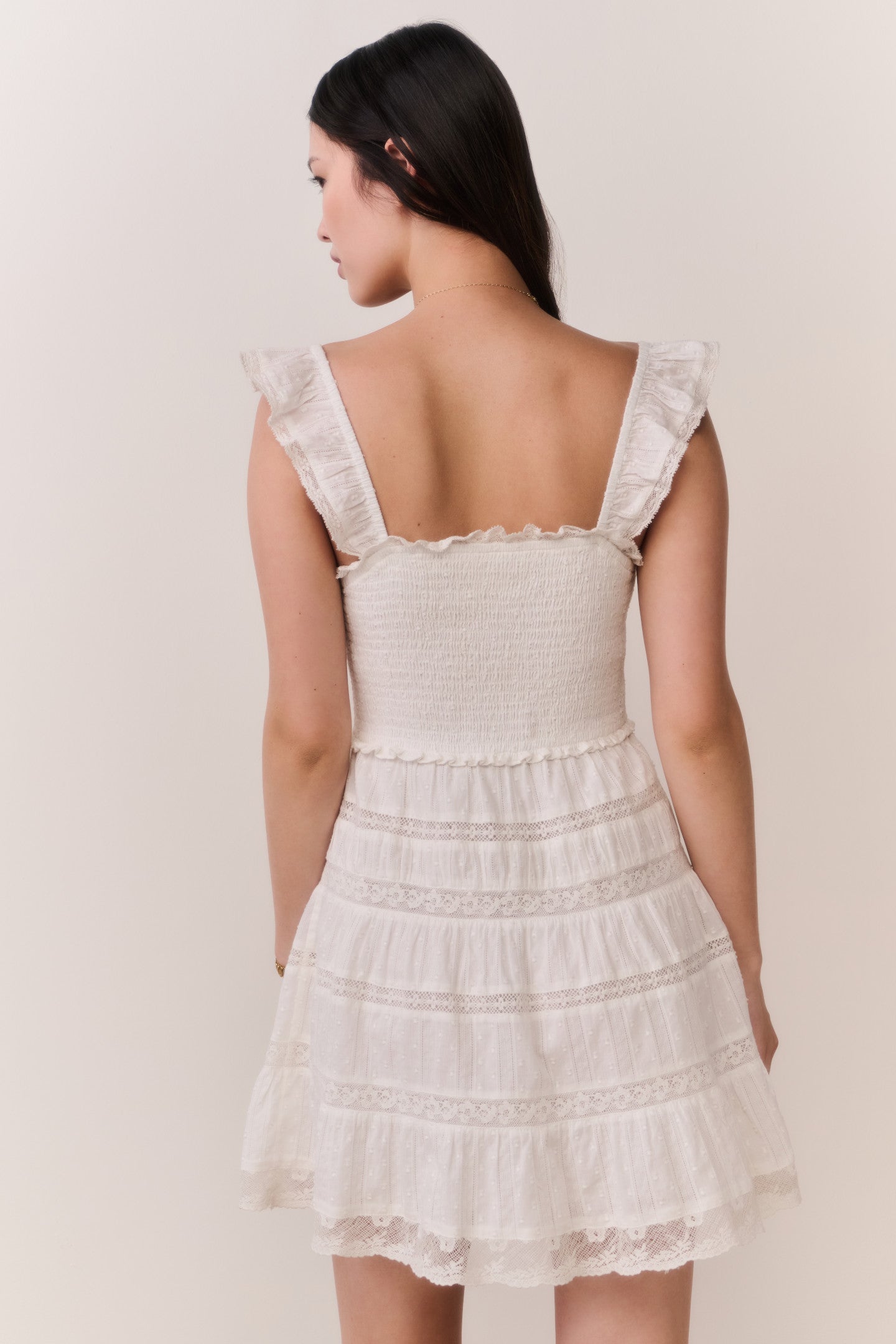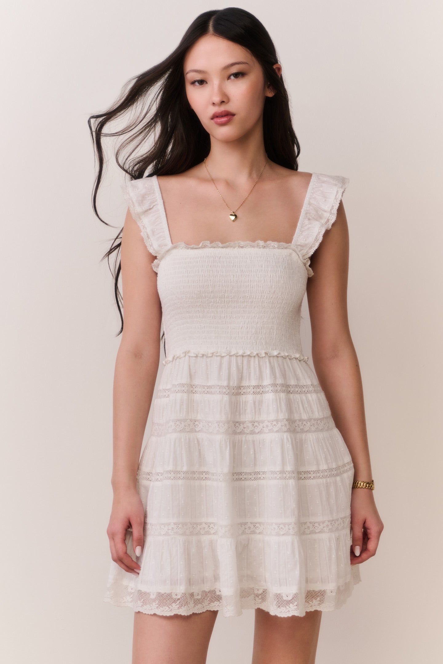 The Colbera Dress is crafted in a lightweight woven fabric that floats with every movement. A square neckline defines the smocked bodice, complemented by short, fluttery ruffle sleeves. Horizontal lace insets and an eyelet-tiered ruffle skirt add delicate contrast and whimsical dimension.