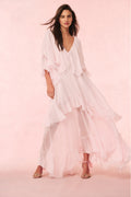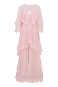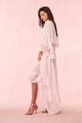 Introducing the Collia Dress. One of the hero pieces of our Spring 2025 runway show and our Founder and Creative Director, Rebecca’s, favorite, Collia Dress debuts with a diaphanous chiffon designed from 100% silk. The viscose, drapey chiffon gives this piece a Bohemian-inspired look and feel. This stunning event gown features a plunging, deep v-neckline with a cape around the shoulders, lovely boho-inspired bell sleeves, a multi-tiered skirt that goes high-to-low at the front then levels out around the hem. Delicate ruffles adorn each tier and the cape. A chiffon self tie detail sits at the back with an open slit. This piece comes fully lined and includes a side seam zipper.