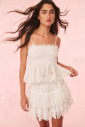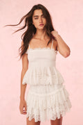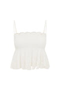 Effortlessly chic in the Condie Top. Designed from an airy cotton, this pretty piece arrives with a beautiful medley of custom-made, large-scale scallop floral eyelet details mixed with smaller eyelets. The smocked top features adjustable spaghetti straps and releases into a peplum hem for a feminine finish.