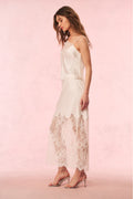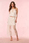 Extra chic in the Constantina Top. This dreamy, boudoir-inspired tank arrives in a drapey, charmeuse fabric featuring a gorgeous chantilly lace as the front with lovely scallop detail. This cami top has a bias cut making it easy to pull on and gives it a comfortable, slinky wear. This top is finished with adjustable spaghetti straps. Pair with the Ilene Skirt for a full set.